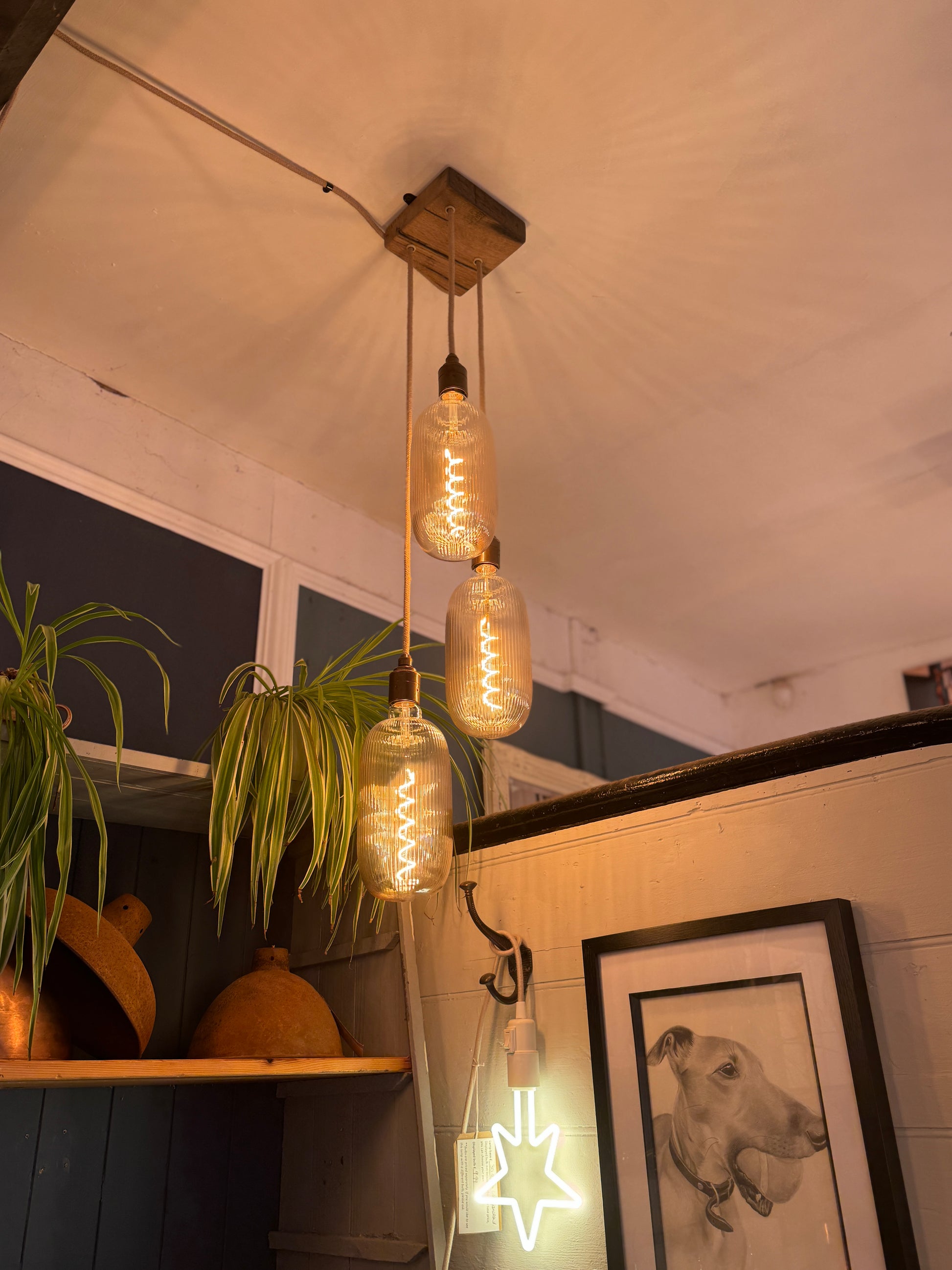 You will receive a made to measure squared oak triple pendant with 3 x cables and 3 x lamp holders, wired and ready to hang, in colours of your choice and lamp holder.